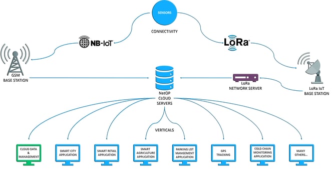 The network topology of two different LPWAN providers: NB-IoT and LoRa (the connection chain starts from top to bottom):